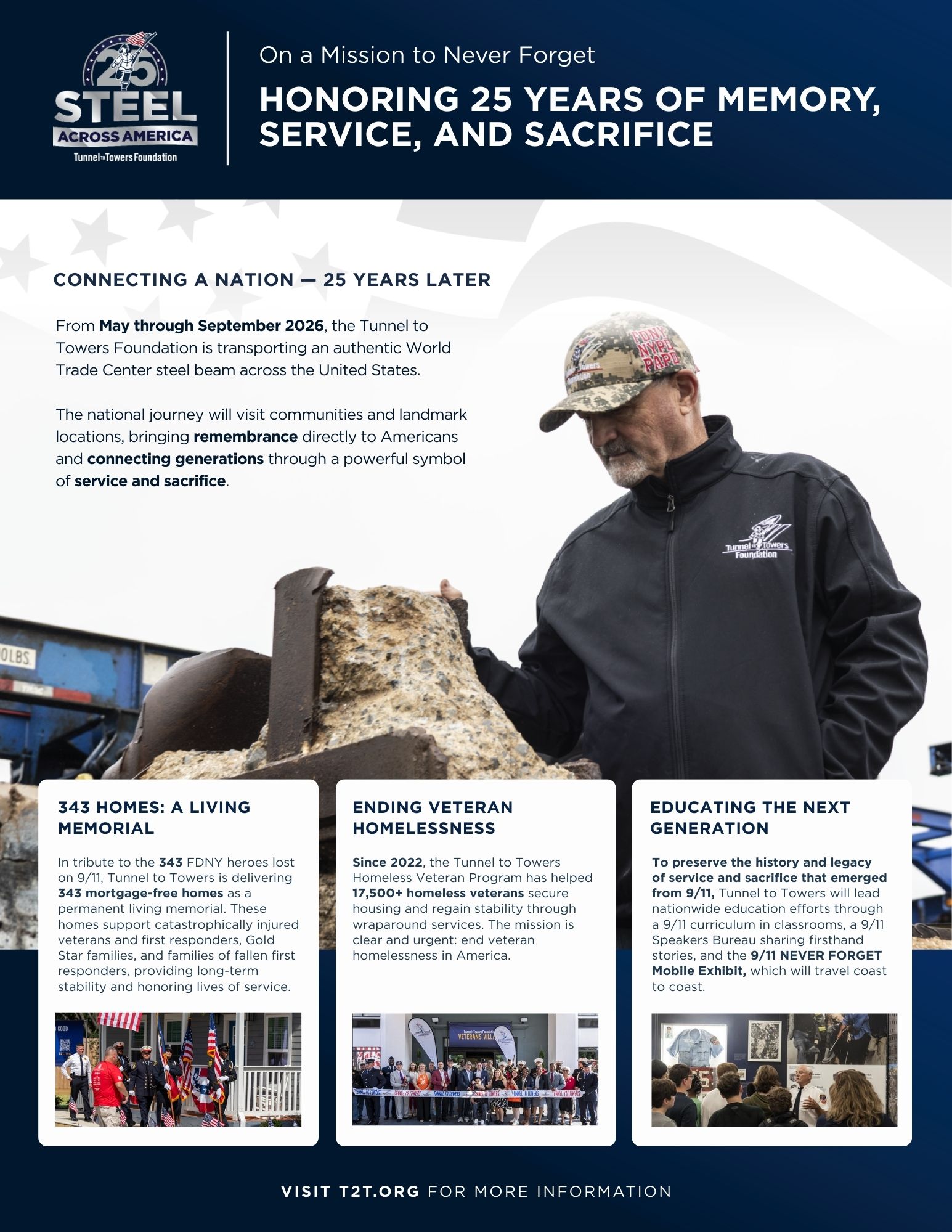 At the heart of our commemoration is Steel Across America, an unprecedented nationwide tour that will transport an authentic steel beam from the World Trade Center to communities across the United States. From May through September 2026, this powerful symbol of reverence and resilience will visit landmark locations, sporting events, and town squares, creating moments of connection for those who lived through 9/11 and educational opportunities for those too young to remember. This journey represents more than remembrance—it’s a bridge between generations and a reminder that the spirit of service embodied by Stephen Siller, and so many others, continues to inspire Americans today.